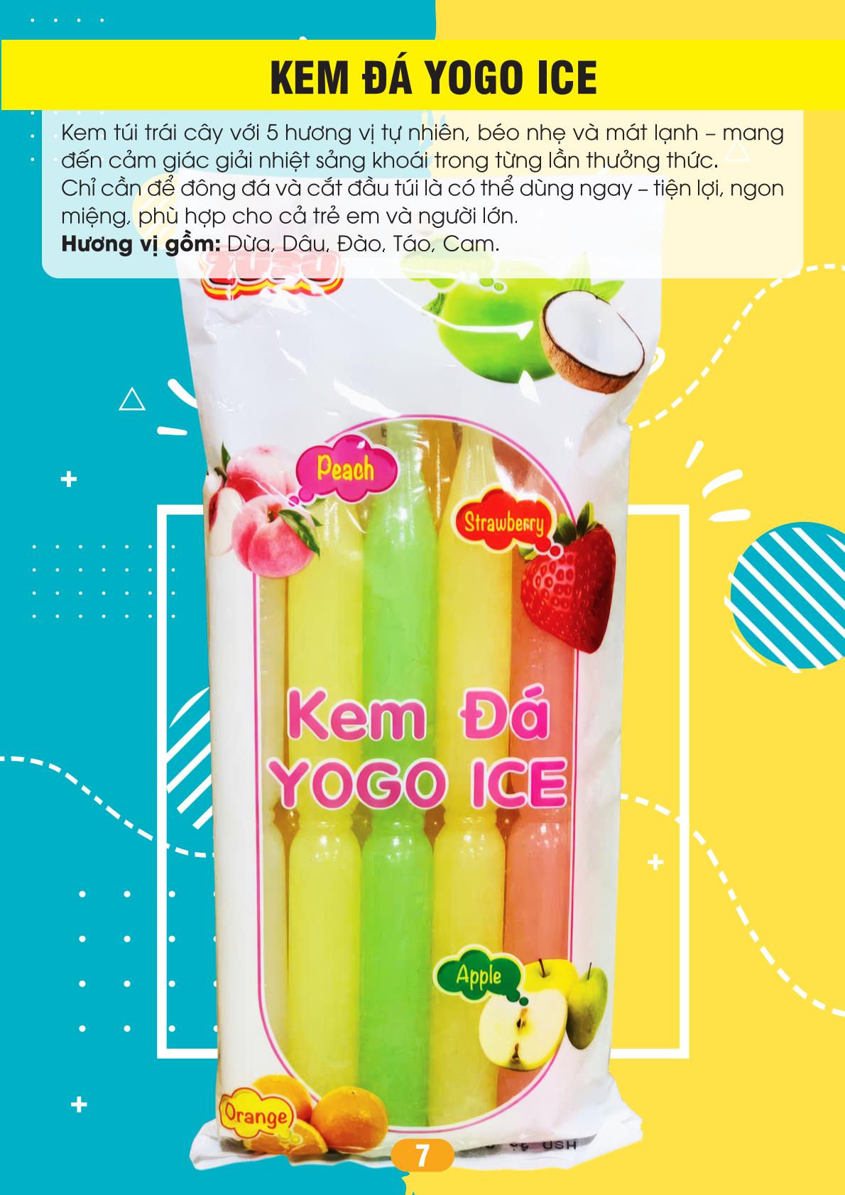 Kem đá YOGO ICE là sản phẩm kem đá túi trái cây mát lạnh, được đóng gói theo bịch mix gồm nhiều hương vị như dừa, dâu, đào, táo và cam. Sản phẩm có vị mát lạnh, béo nhẹ và dễ ăn, chỉ cần để đông và cắt đầu túi là có thể sử dụng ngay. Với nhiều hương vị trong cùng một bịch, YOGO ICE mang đến sự đa dạng khi thưởng thức, phù hợp cho gia đình, trẻ em và sử dụng trong những ngày nắng nóng.
